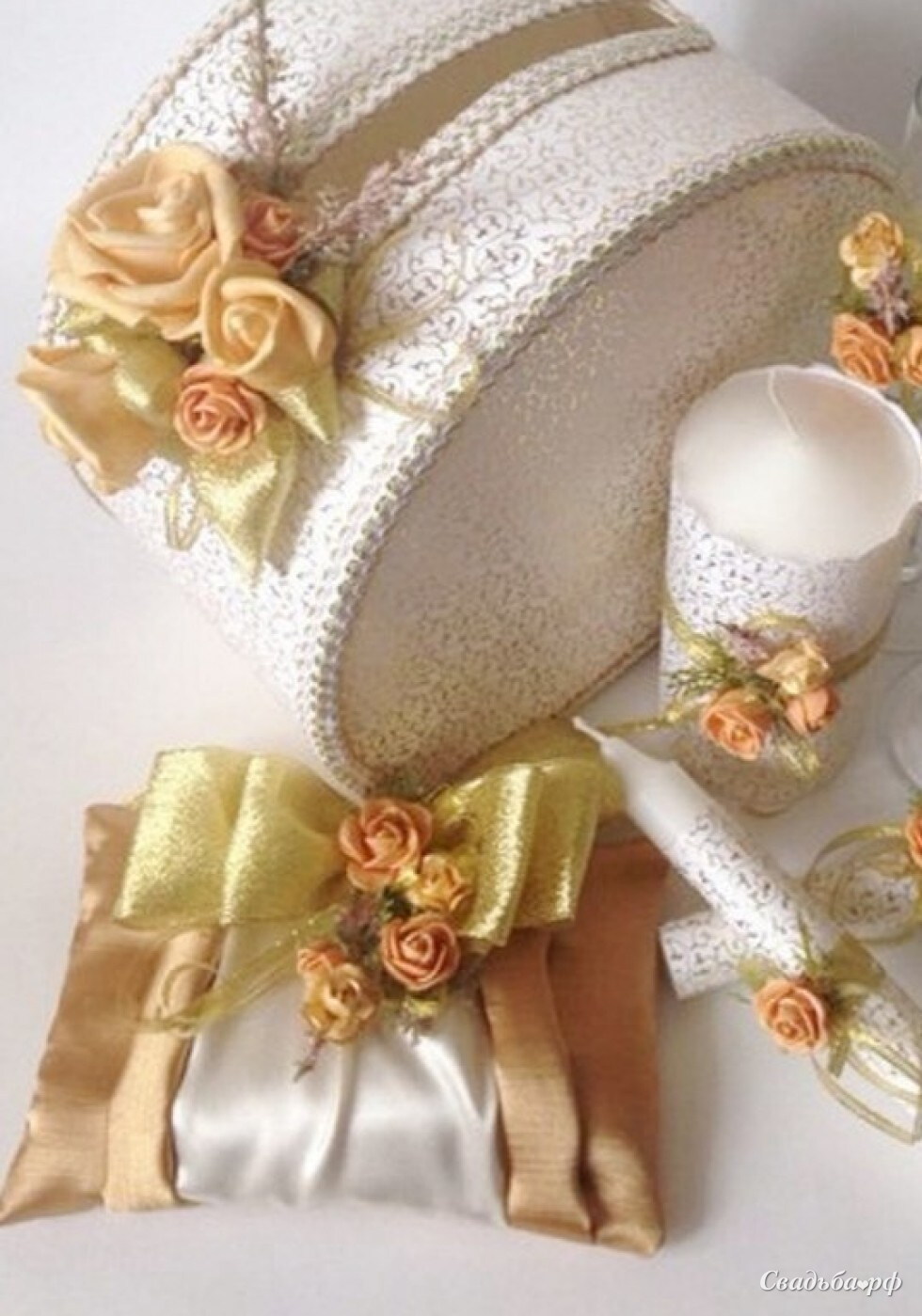 Набор состоит из подушки для колец, казны, бокалов (2 шт), свадебного очага (3 свечи)
