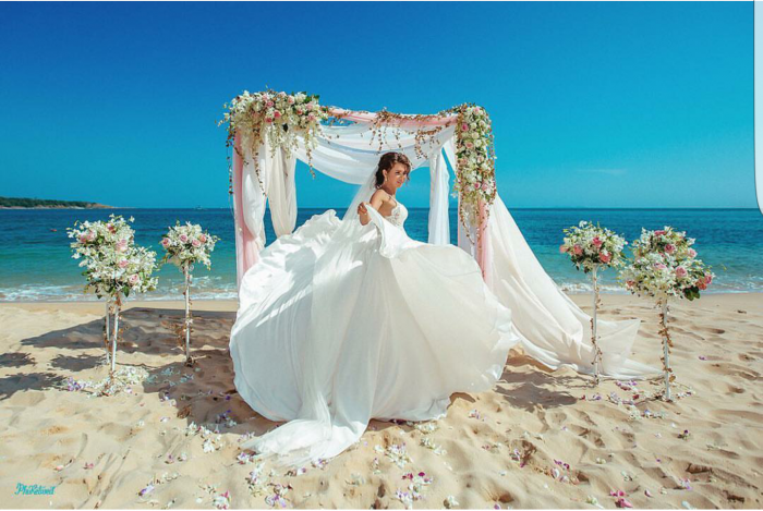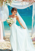 Шикарное платье для летней свадьбы. Шилось на заказ. Кружево, шифон, атлас, высокий разрез по ноге, длинный шлейф, фата.